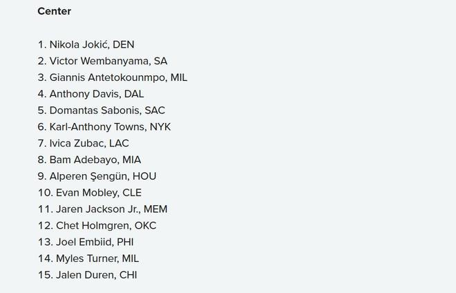 1-5名:约基奇、文班、字母哥、浓眉哥、小萨;